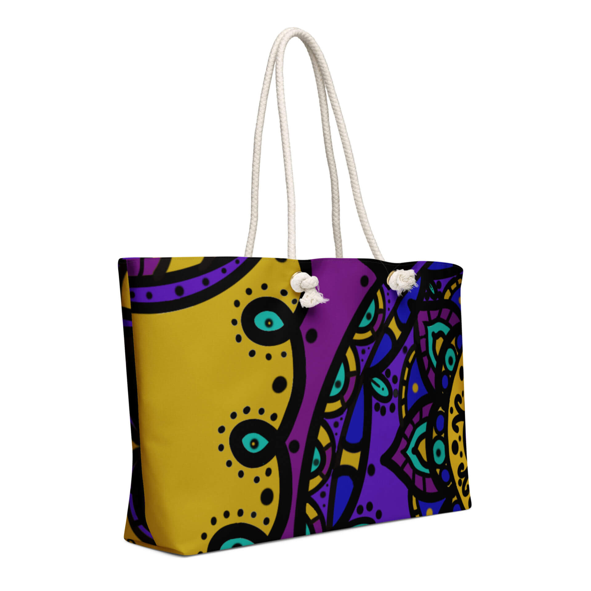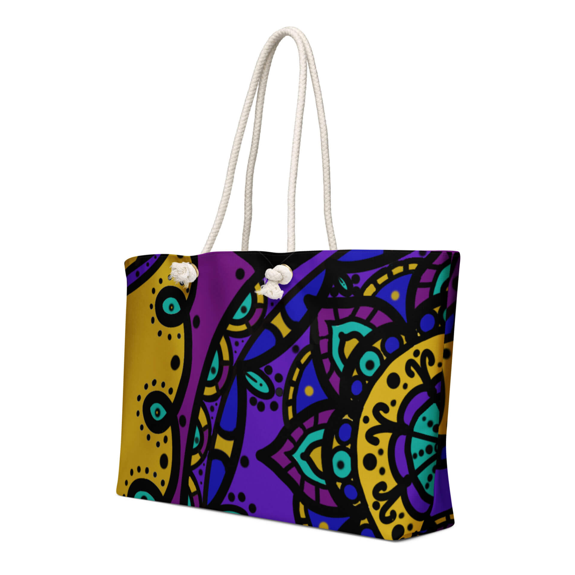 • Cream-colored cotton rope handles through metal grommets