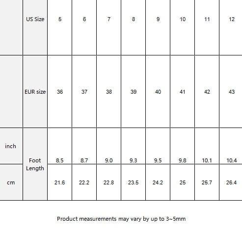 | EUR Size | US Size | Insole Length(inch) | Insole Length(mm) |