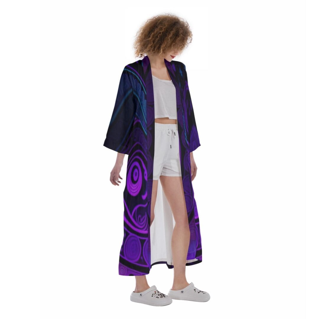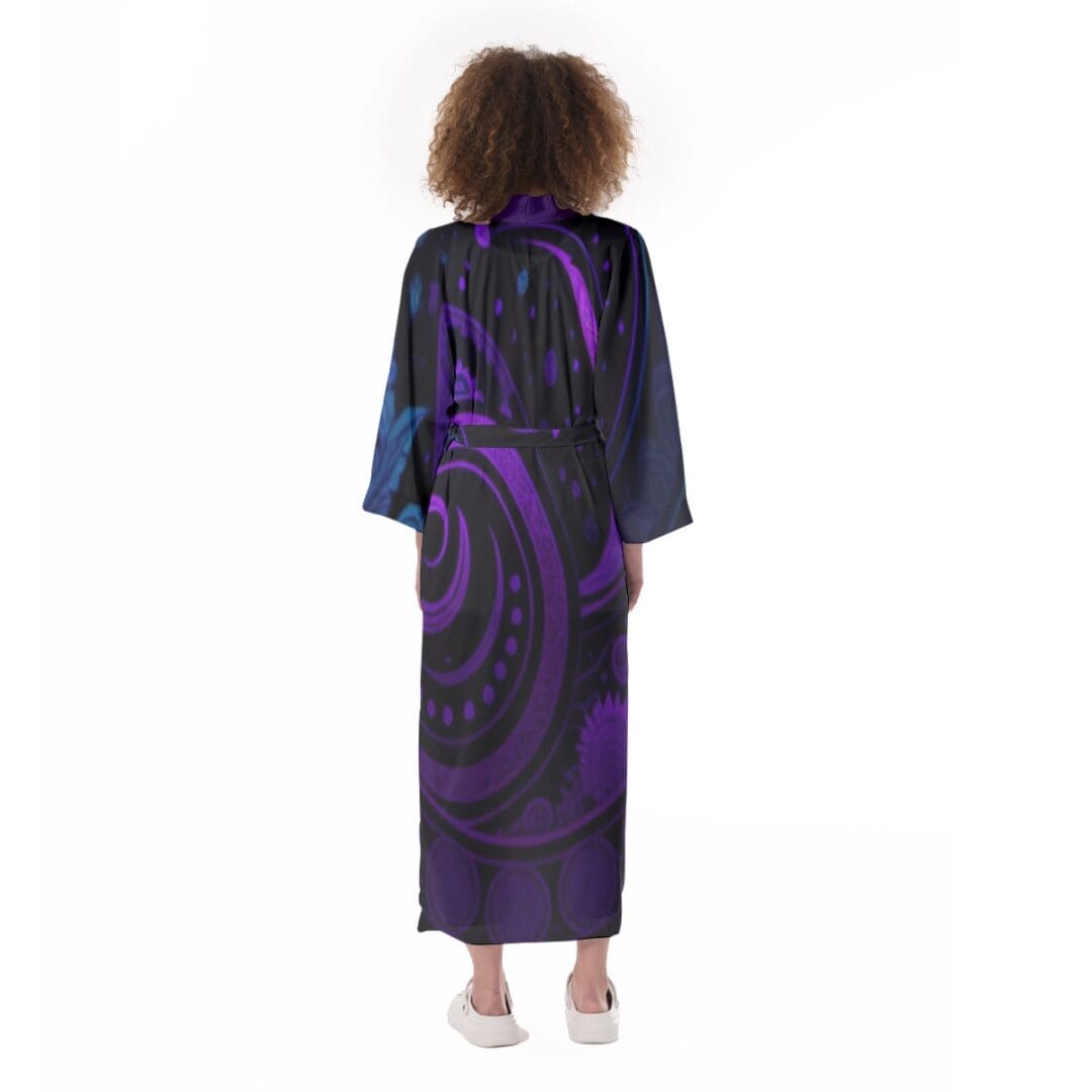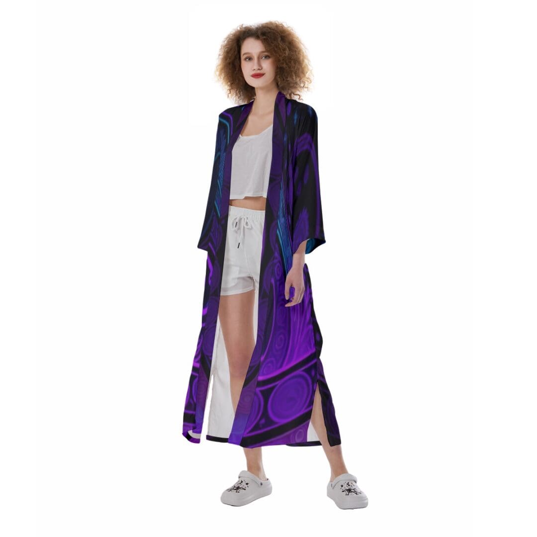 - Removable waist tie closure, long robe, side slit.