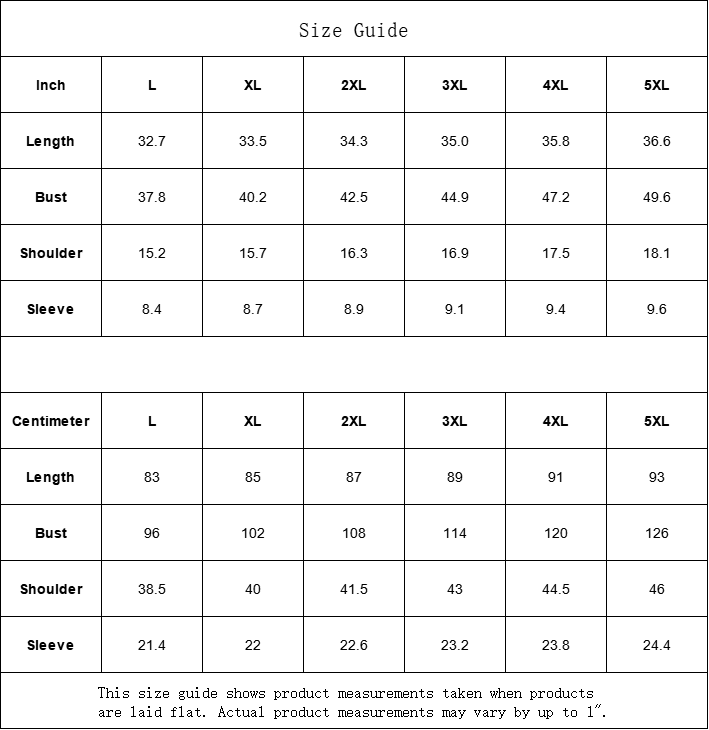 | Inch | L | XL | 2XL | 3XL | 4XL | 5XL |